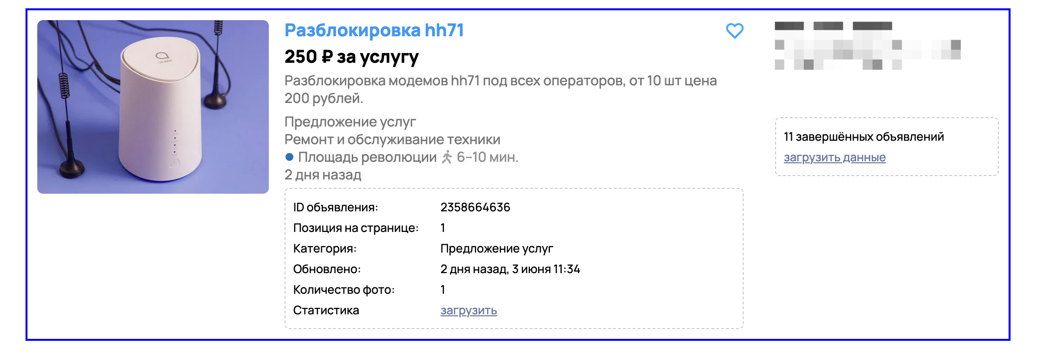 Здесь же можно загрузить дополнительную информацию о продавце. Вот так выглядит объявление со всеми подгруженными данныеми: